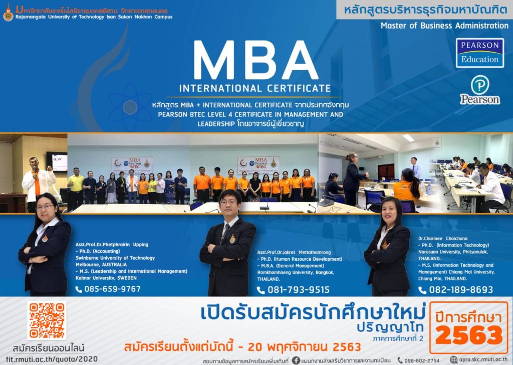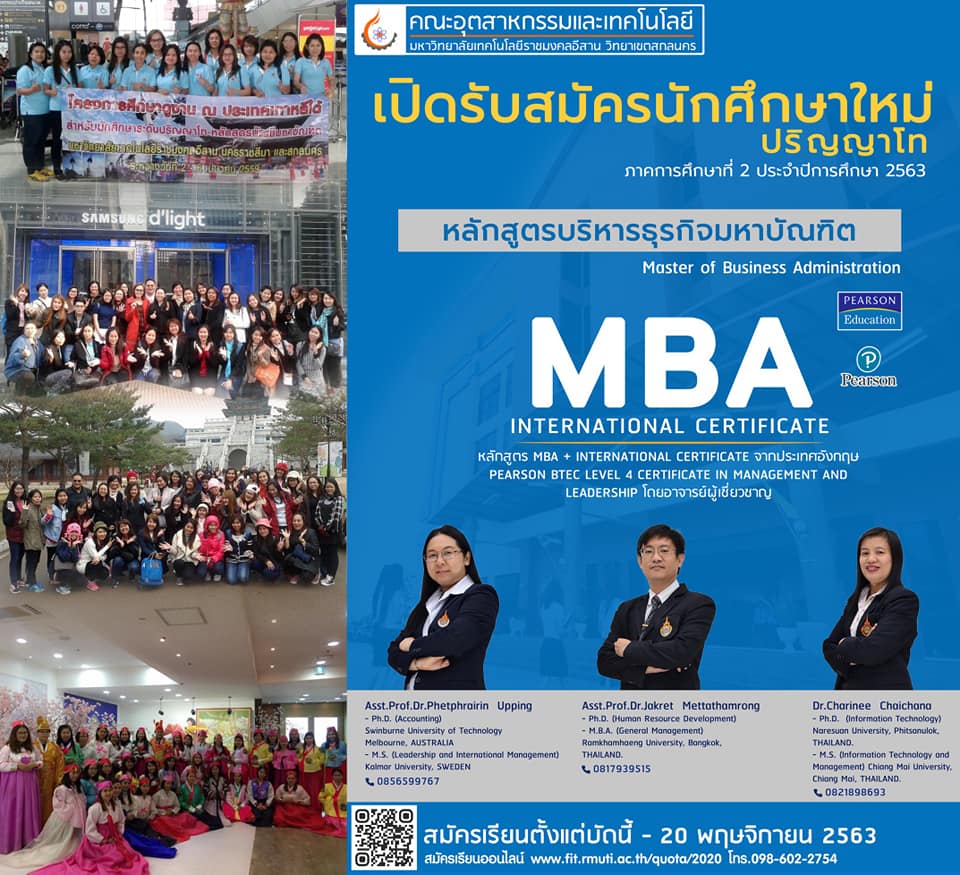 ประกาศรับสมัครบุคคลเพื่อเข้าศึกษาต่อระดับปริญญาโท “หลักสูตรบริหารธุรกิจมหาบัณฑิต MBA” ภาคการศึกษาที่ 2 ปีการศึกษา 2563 สมัครเรียนได้ตั้งแต่ บัดนี้ – 20 พฤษจิกายน 2563 สอบถามข้อมูลเพิ่มเติมได้ที่โทร. 081-7939515 หรือ 098-602-2754