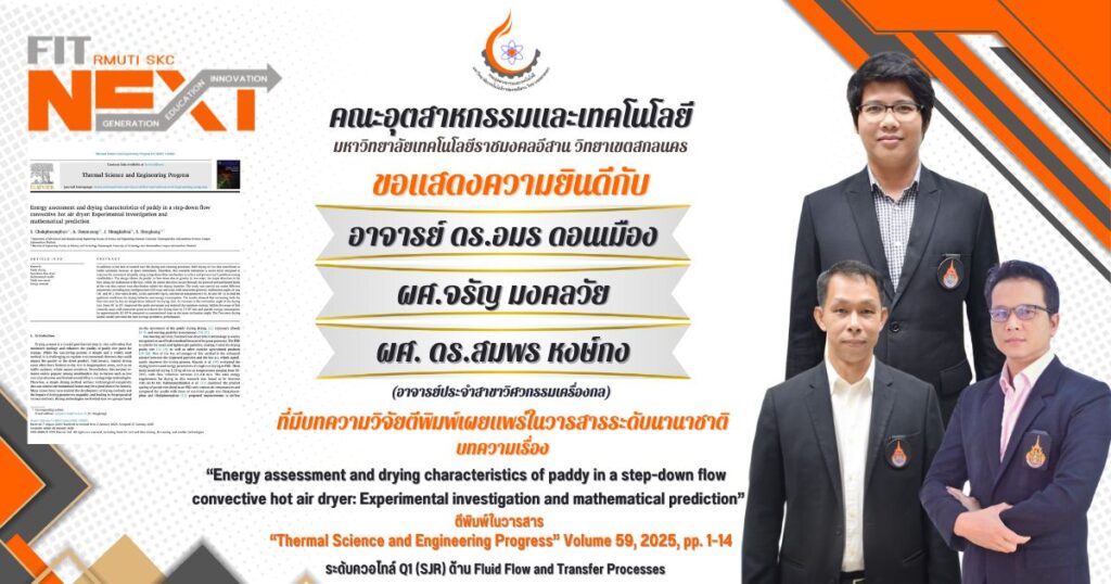 บทความเรื่อง “Energy assessment and drying characteristics of paddy in a step-down flow convective hot air dryer: Experimental investigation and mathematical prediction”
