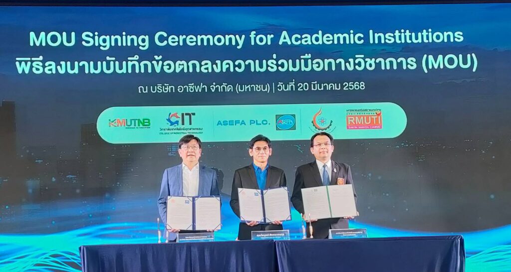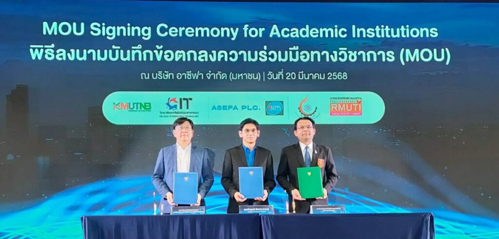 วันที่ 20 มีนาคม 2568 คณะอุตสาหกรรมและเทคโนโลยี มหาวิทยาลัยเทคโนโลยีราชมงคลอีสาน วิทยาเขตสกลนคร นำโดย ผศ. ดร.สุริยา แก้วอาษา คณบดีคณะอุตสาหกรรมและเทคโนโลยี พร้อมคณะ เข้าร่วมพิธีลงนามบันทึกข้อตกลงความร่วมมือทางวิชาการ (MOU) กับบริษัท อาซีฟา จำกัด (มหาชน) ในงาน ASEFA INOVATION DAY 2025 ณ บริษัท อาซีฟา จำกัด (มหาชน) จังหวัดสมุทรสาคร เพื่อส่งเสริมความร่วมมือในการผลิตบัณฑิตนักปฏิบัติ อีกทั้งยังเป็นการแลกเปลี่ยนองค์ความรู้ทางด้านวิชาการ งานวิจัย และเทคโนโลยีต่าง ๆ เพื่อก่อให้เกิดประโยชน์สูงสุดแก่ประเทศ
