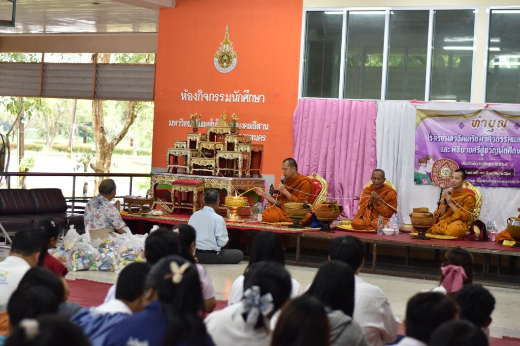 วันที่ 30 สิงหาคม 2568 โรงเรียนสาธิตเตรียมวิศวกรรมและเทคโนโลยี คณะอุตสาหกรรมและเทคโนโลยี นำโดย อาจารย์เมธา ทัศคร หัวหน้าโรงเรียนสาธิตเตรียมวิศวกรรมและเทคโนโลยี พร้อมด้วยคณาจารย์และนักศึกษา จัดพิธีทำบุญโรงเรียนและพิธีบายศรีสู่ขวัญ นักศึกษาใหม่ ประจำปีการศึกษา 2568 ณ อาคารอเนกประสงค์ มหาวิทยาลัยเทคโนโลยีราชมงคลอีสาน วิทยาเขตสกลนคร เพื่อความเป็นสิริมงคล เสริมสร้างความสามัคคี สืบสานวัฒนธรรม ตลอดจนเป็นการต้อนรับนักศึกษาใหม่ สร้างขวัญกำลังใจ และเป็นมงคล ต่อการเริ่มต้นชีวิตการศึกษา โดยมีกิจกรรมทำบุญตักบาตร ถวายภัตตาหารเช้าแด่พระภิกษุสงฆ์ พิธีบายศรีสู่ขวัญ ผูกข้อมือรับขวัญนักศึกษาใหม่ และยังมีการทำโรงทานโดยคณะผู้ปกครอง และคณาจารย์อีกด้วย