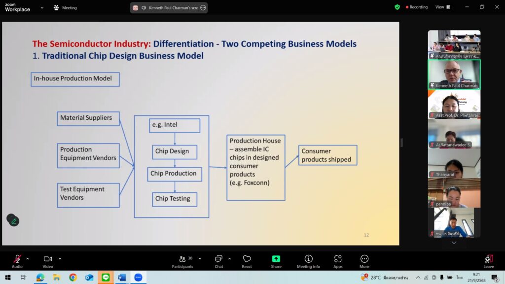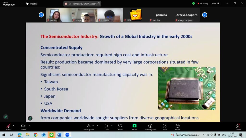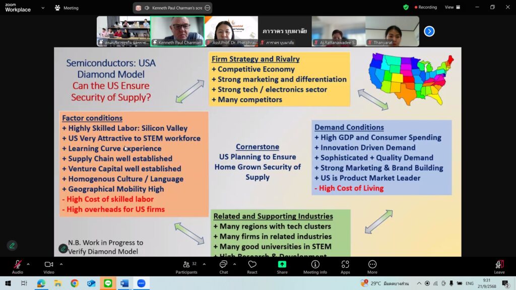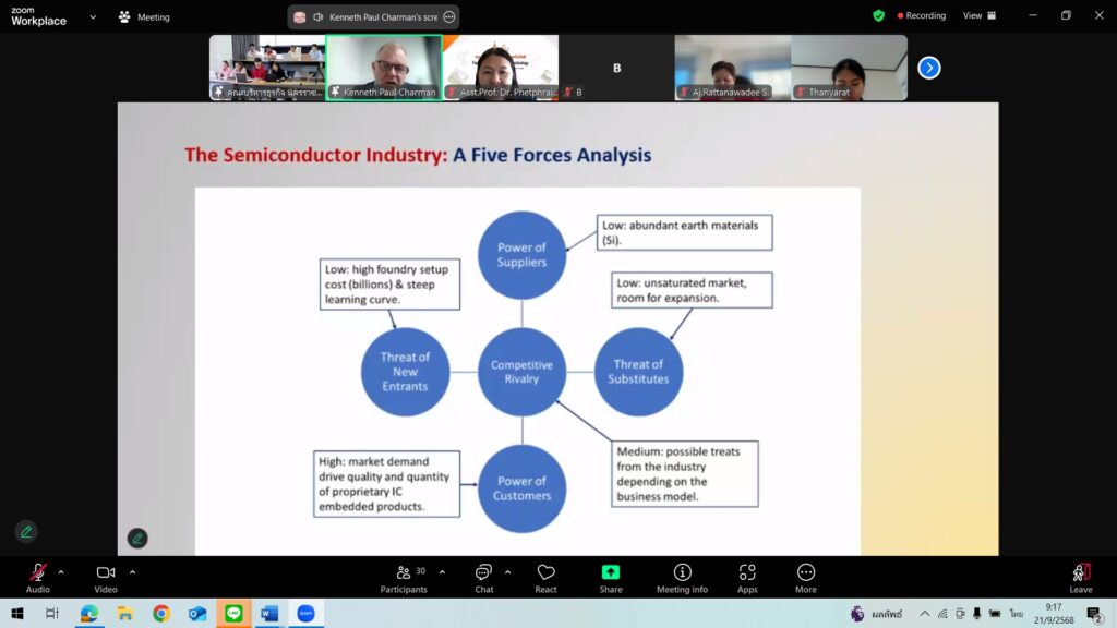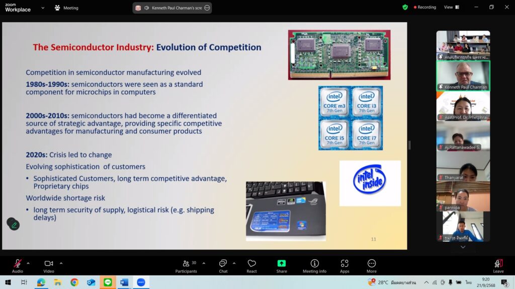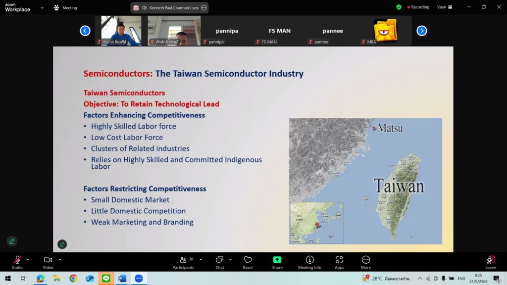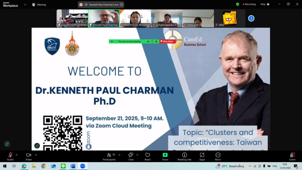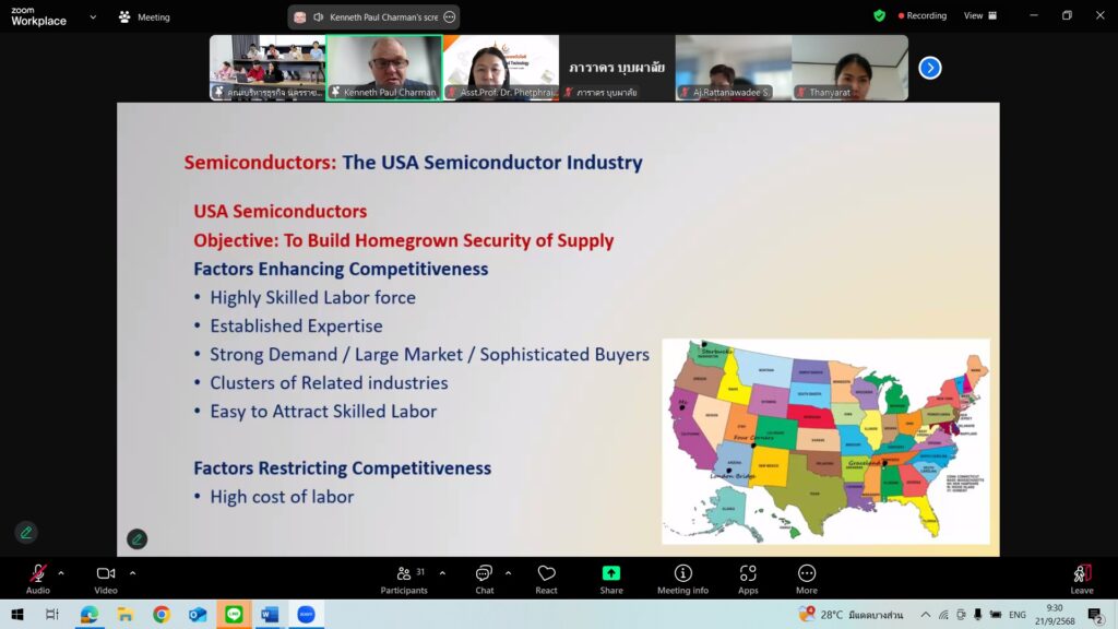 วันที่ 21 กันยายน 2568 อาจารย์และนักศึกษา ระดับปริญญาโท และระดับปริญญาเอก หลักสูตรบริหารธุรกิจมหาบัณฑิต และหลักสูตรบริหารธุรกิจดุษฎีบัณฑิต คณะอุตสาหกรรมและเทคโนโลยี มหาวิทยาลัยเทคโนโลยีราชมงคลอีสาน วิทยาเขตสกลนคร เข้าร่วมรับฟังการบรรยายพิเศษ ร่วมกับ อาจารย์และนักศึกษา 9 มหาวิทยาลัยเทคโนโลยีราชมงคล (9 มทร.) ในหัวข้อ Clusters and Competitiveness : Taiwan Semiconductors Industry จาก Professor Dr. Kenneth Pual Charman Ph.D. จาก CamEd Business School ผ่านระบบออนไลน์ Zoom Meeting นักศึกษาได้เรียนรู้กลยุทธ์การสร้างความยั่งยืนของธุรกิจระหว่างประเทศ เช่น ธุรกิจ Semiconductors ในกลุ่มประเทศ สหรัฐอเมริกา กลุ่มประเทศทวีปยุโรป รวมถึงประเทศในภูมิภาคเอเชีย เช่น ประเทศใต้หวัน กลยุทธ์การแข่งขันที่ยั่งยืนคือ Cost Leadership ความเป็นผู้นำด้านต้นทุนต่ำด้านแรงงานทักษะสูง ทำให้นักศึกษาได้เรียนรู้กลยุทธ์ทางธุรกิจชั้นนำด้านความเป็นเลิศผู้นำด้านต้นทุนของประเทศใต้หวัน ที่สามารถครองความเป็นผู้นำในธุรกิจ Semiconductors ในภูมิภาคเอเชีย
