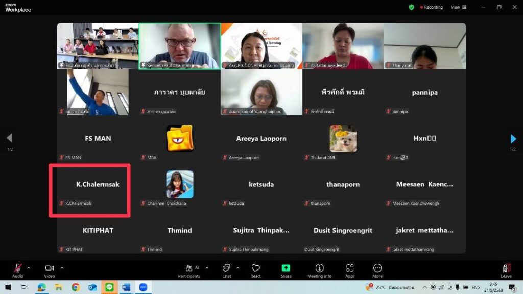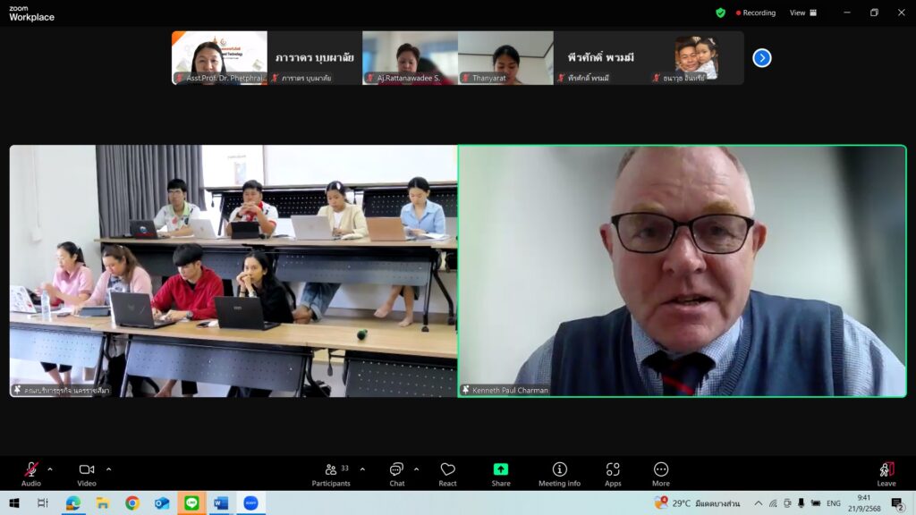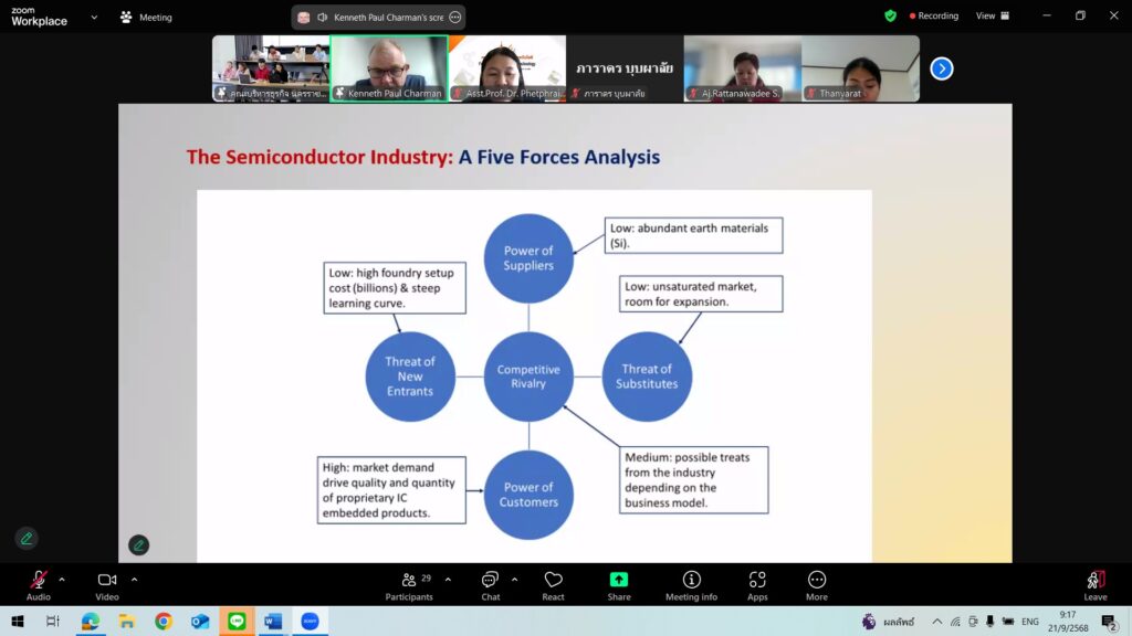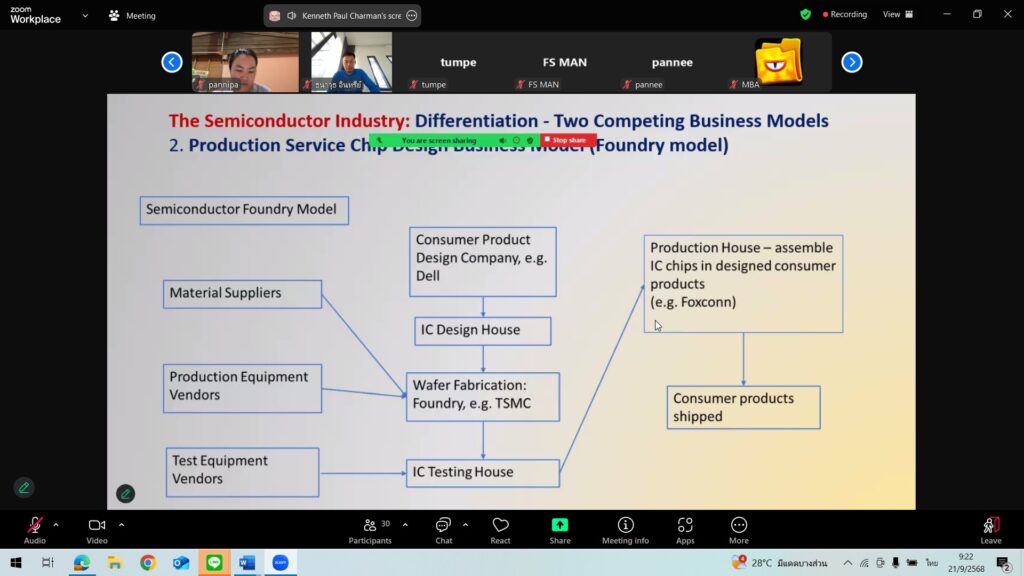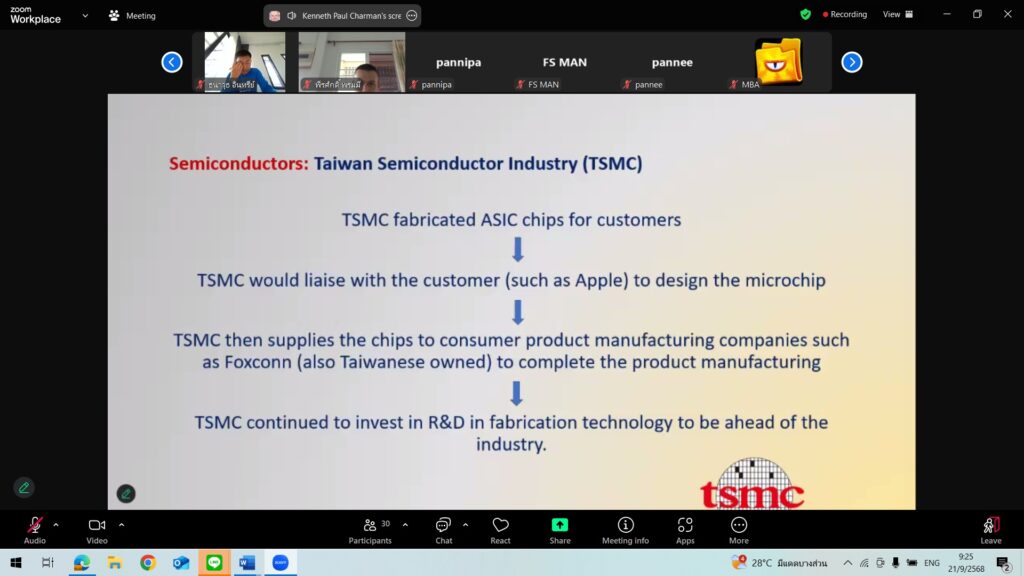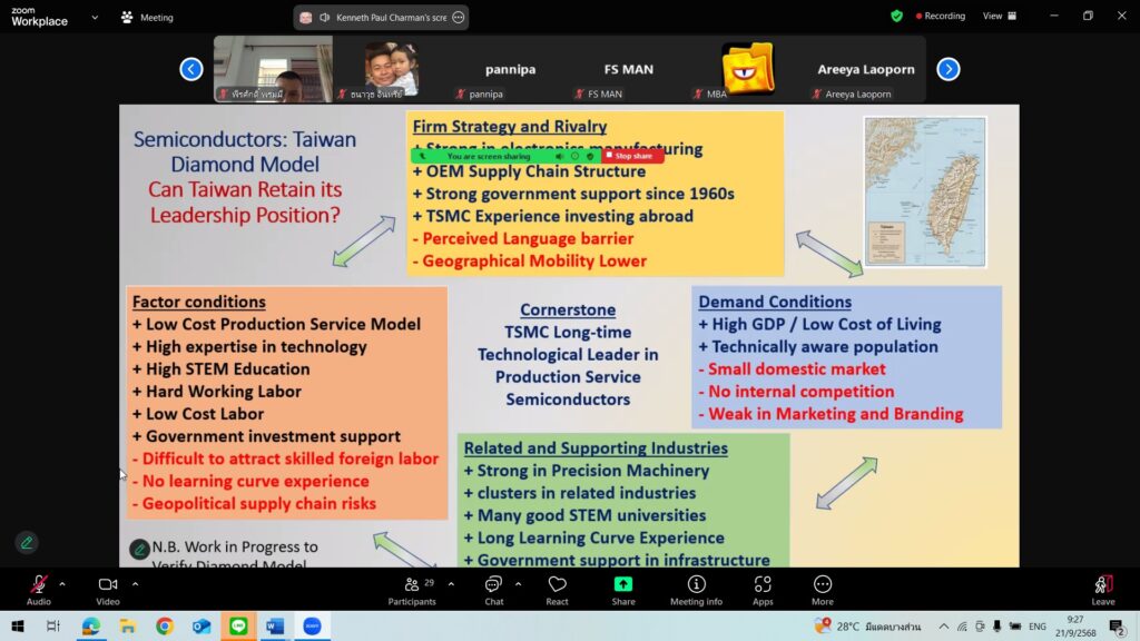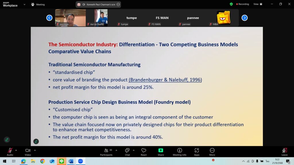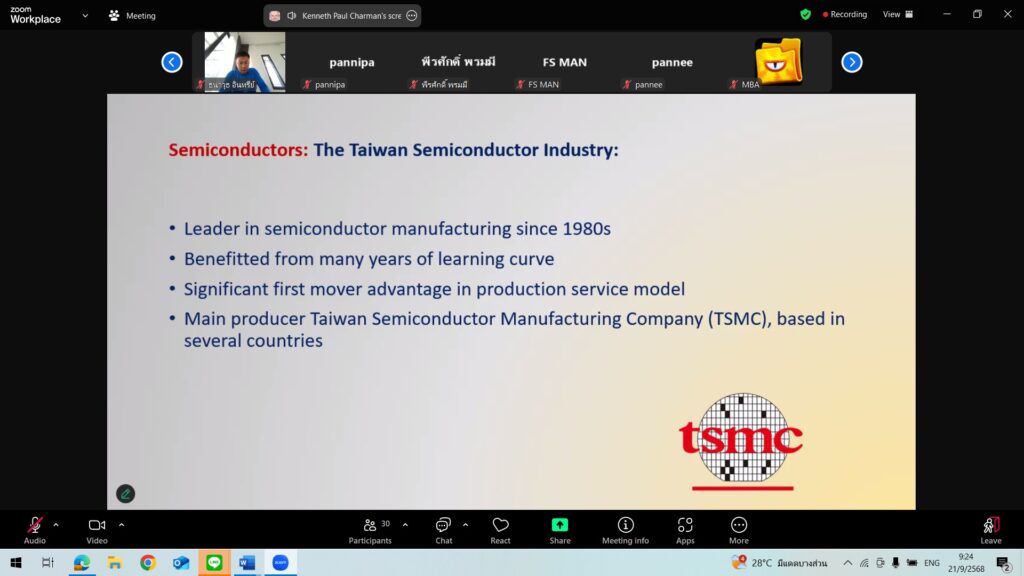 วันที่ 21 กันยายน 2568 อาจารย์และนักศึกษา ระดับปริญญาโท และระดับปริญญาเอก หลักสูตรบริหารธุรกิจมหาบัณฑิต และหลักสูตรบริหารธุรกิจดุษฎีบัณฑิต คณะอุตสาหกรรมและเทคโนโลยี มหาวิทยาลัยเทคโนโลยีราชมงคลอีสาน วิทยาเขตสกลนคร เข้าร่วมรับฟังการบรรยายพิเศษ ร่วมกับ อาจารย์และนักศึกษา 9 มหาวิทยาลัยเทคโนโลยีราชมงคล (9 มทร.) ในหัวข้อ Clusters and Competitiveness : Taiwan Semiconductors Industry จาก Professor Dr. Kenneth Pual Charman Ph.D. จาก CamEd Business School ผ่านระบบออนไลน์ Zoom Meeting นักศึกษาได้เรียนรู้กลยุทธ์การสร้างความยั่งยืนของธุรกิจระหว่างประเทศ เช่น ธุรกิจ Semiconductors ในกลุ่มประเทศ สหรัฐอเมริกา กลุ่มประเทศทวีปยุโรป รวมถึงประเทศในภูมิภาคเอเชีย เช่น ประเทศใต้หวัน กลยุทธ์การแข่งขันที่ยั่งยืนคือ Cost Leadership ความเป็นผู้นำด้านต้นทุนต่ำด้านแรงงานทักษะสูง ทำให้นักศึกษาได้เรียนรู้กลยุทธ์ทางธุรกิจชั้นนำด้านความเป็นเลิศผู้นำด้านต้นทุนของประเทศใต้หวัน ที่สามารถครองความเป็นผู้นำในธุรกิจ Semiconductors ในภูมิภาคเอเชีย