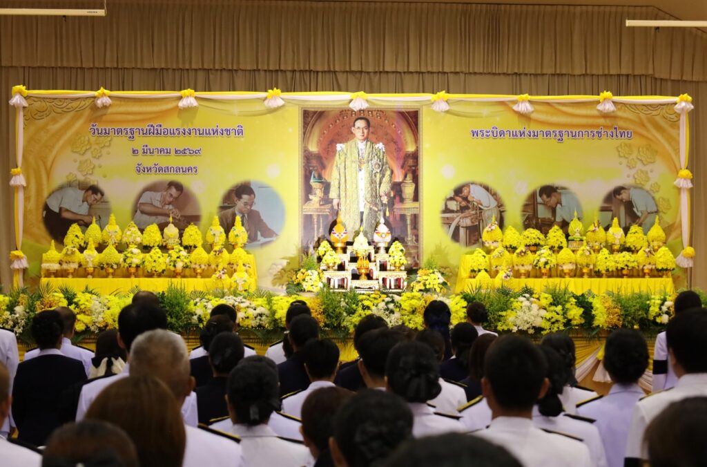 วันที่ 2 มีนาคม 2569 คณะอุตสาหกรรมและเทคโนโลยี นำโดย ผศ. ดร.นิรุต อ่อนสลุง ผู้ช่วยคณบดีด้านวิจัยและบริการวิชาการ พร้อมด้วย นางอมร คำมูล หัวหน้าสำนักงานคณบดี และ นางธนพร ผิวคำ หัวหน้าแผนกงานวิชาการและวิจัย เป็นผู้แทนเข้าร่วมพิธีวางพานพุ่ม ถวายราชสักการะแด่ พระบาทสมเด็จพระบรมชนกาธิเบศร มหาภูมิพลอดุลยเดชมหาราช บรมนาถบพิตร “พระบิดาแห่งมาตรฐานการช่างไทย” เนื่องในวันมาตรฐานฝีมือแรงงานแห่งชาติ ประจำปี 2569 เพื่อเป็นการน้อมรำลึกในพระมหากรุณาธิคุณอันหาที่สุดมิได้ของพระบาทสมเด็จ พระบรมชนกาธิเบศร มหาภูมิพลอดุลยเดชมหาราช บรมนาถบพิตร ที่ทรงมีพระมหากรุณาธิคุณต่อปวงชนชาวไทย และทรงมีพระปรีชาสามารถด้านการช่าง รวมทั้งทรงให้ความสำคัญในการพัฒนาฝีมือแรงงานของช่างไทยให้มีความเป็นมาตรฐาน ณ หอประชุมจามจุรี มหาวิทยาลัยราชภัฏสกลนคร ตำบลธาตุเชิงชุม อำเภอเมืองสกลนคร จังหวัดสกลนคร