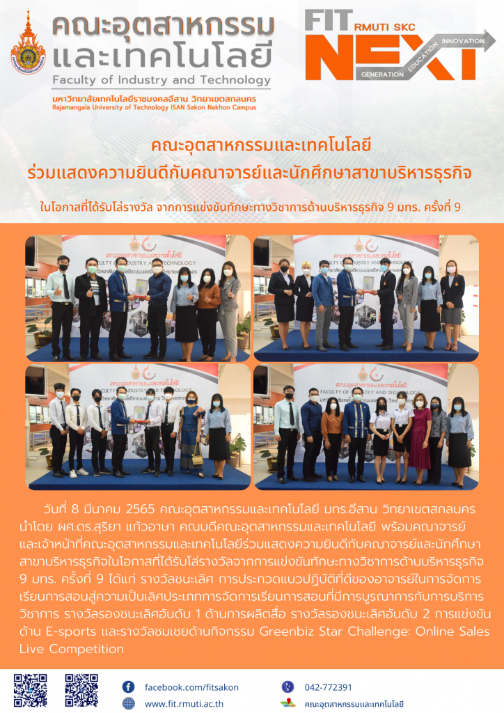 วันที่ 8 มีนาคม 2565 คณะอุตสาหกรรมและเทคโนโลยี มทร.อีสาน วิทยาเขตสกลนคร นำโดย ผศ.ดร.สุริยา แก้วอาษา คณบดีคณะอุตสาหกรรมและเทคโนโลยี พร้อมคณาจารย์และเจ้าหน้าที่คณะอุตสาหกรรมและเทคโนโลยีร่วมแสดงความยินดีกับคณาจารย์และนักศึกษา สาขาบริหารธุรกิจในโอกาสที่ได้รับโล่รางวัลจากการแข่งขันทักษะทางวิชาการด้านบริหารธุรกิจ 9 มทร. ครั้งที่ 9 ได้แก่ รางวัลชนะเลิศ การประกวดแนวปฏิบัติที่ดีของอาจารย์ในการจัดการ เรียนการสอนสู่ความเป็นเลิศประเภทการจัดการเรียนการสอนที่มีการบูรณาการกับการบริการวิชาการ รางวัลรองชนะเลิศอันดับ 1 ด้านการผลิตสื่อ รางวัลรองชนะเลิศอันดับ 2 การแข่งขันด้าน E-sports เเละรางวัลชมเชยด้านกิจกรรม Greenbiz Star Challenge: Online Sales Live Competition